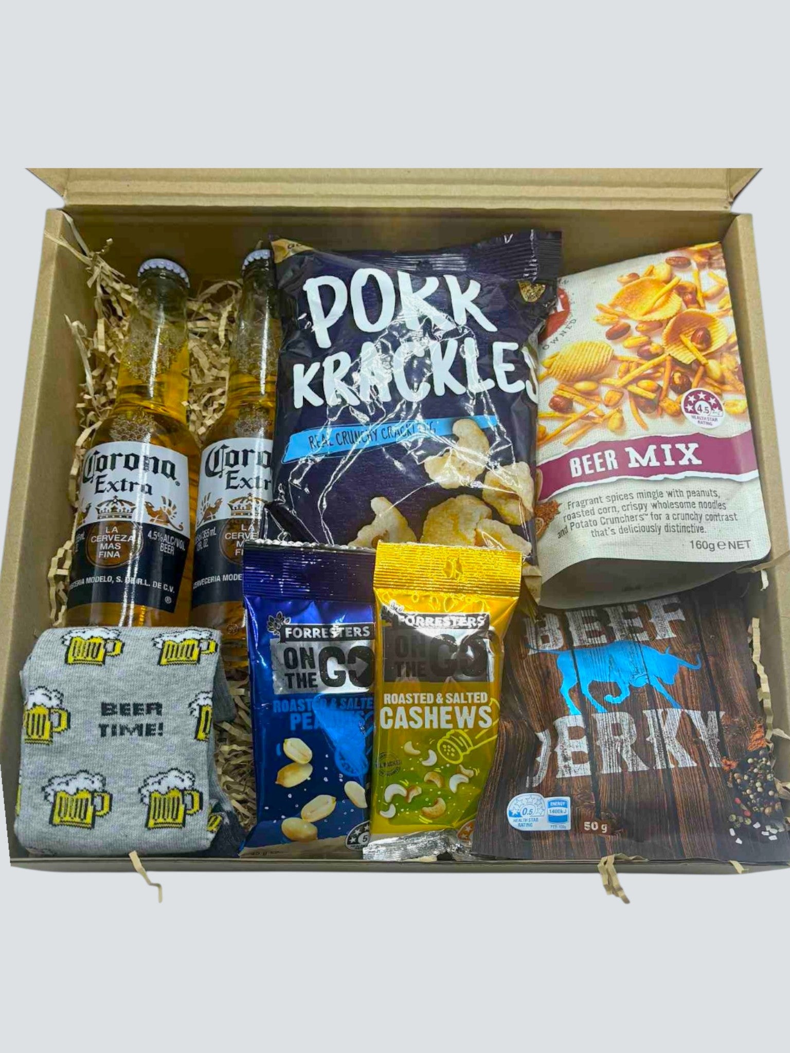 Beer Bottles x2, Pork Crackle (50g), Bhuja Beer Mix (160g), Beef Jerky Original (50g), Salted Peanuts and Cashews x2 (45g), Packet of socks. Presented in a Gift Box. (Contact us directly for different beer selection).
