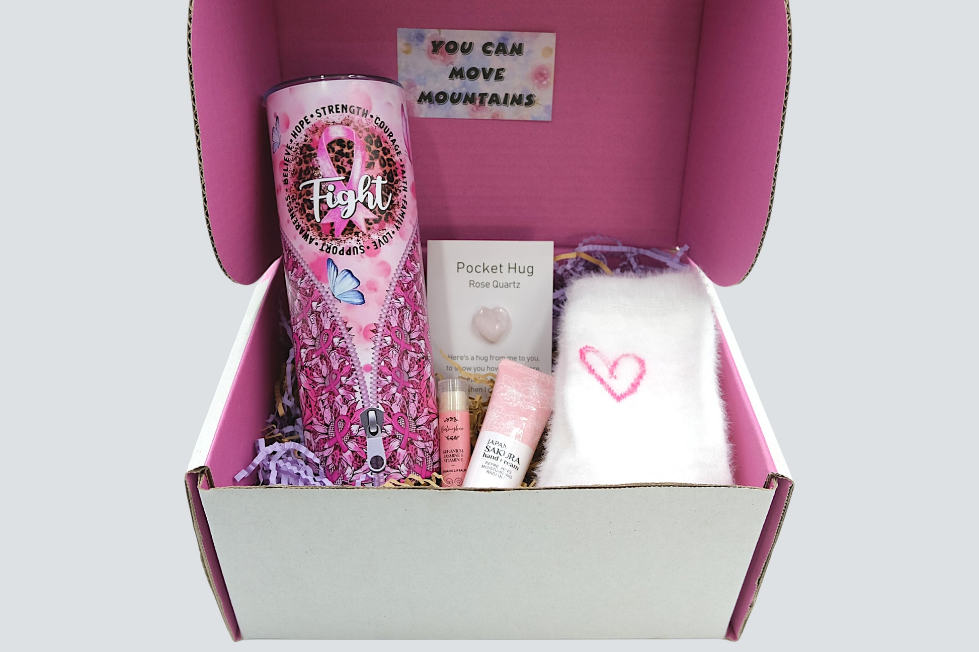 Inspirational Metal Tumbler with Straw (20oz), Fluffy Love Heart Comfort Socks, Japan Sakura Hand Cream (30gm), Flavoured Lip Balm (Chosen at Random), Rose Quartz Pocket Hug. Presented in a Gift Box.