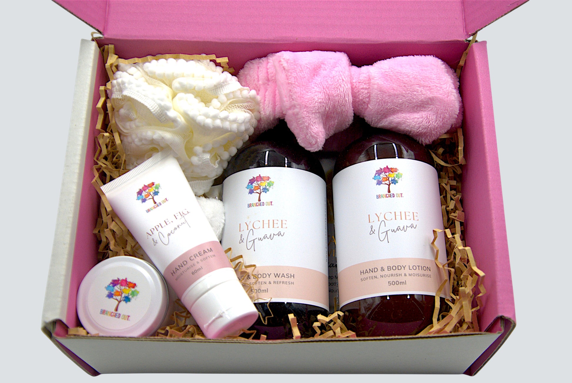 Lavender and Rose bath salts (200g), Collagen Face mask, Hydrating lip mask, Under eye hydration, Scrunchie, Loofah Mitt, Fluffy Socks, Tahitian Vanilla Diffuser, Rose Quartz soap, Soap Bag, Apple and Fig Hand cream, Rose Quartz candle, Sleep Mask, Lavender Lip Balm, Loofah. Presented in a Gift Box.