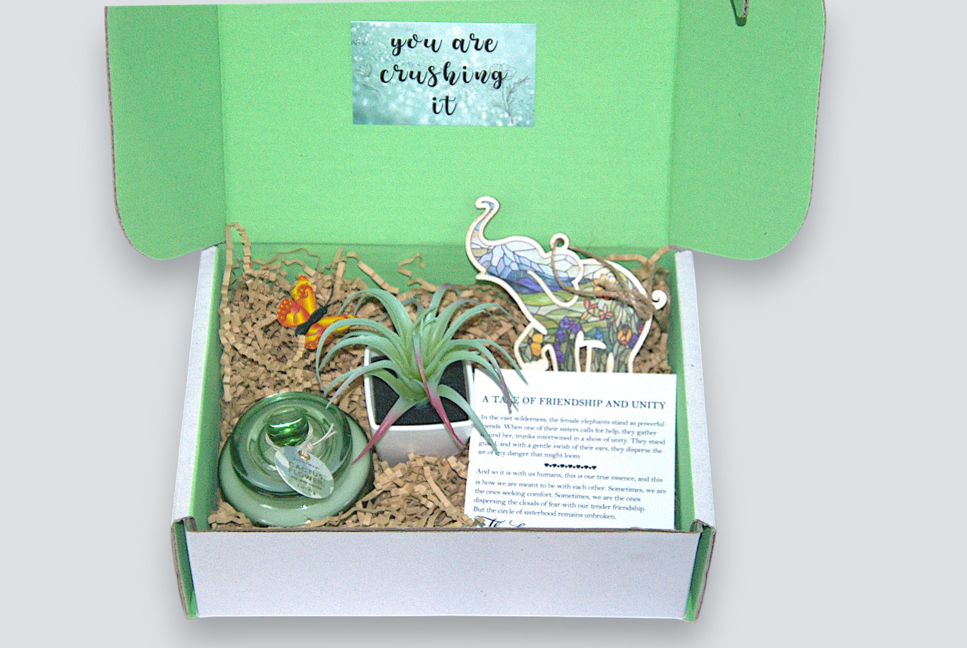 Elephant with Friendship Card, Cactus Flower Candle- Fresh Fragrance (3oz), Artificial Succulent. Presented in a Gift Box.