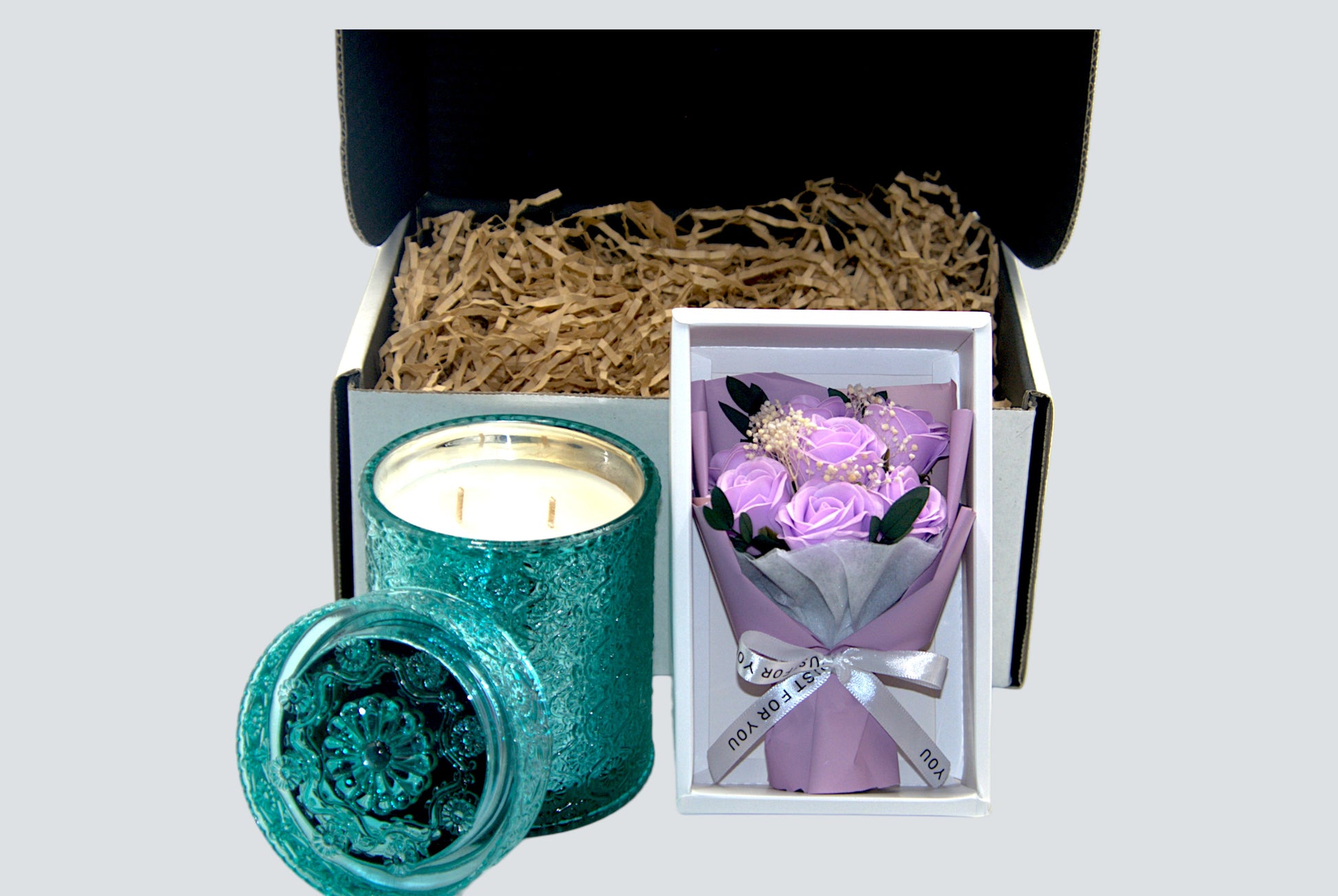 Gift Box includes a 460g soy candle in a glass coloured jar, with a artificial flower posy. Presented in a Gift Box. Teal- Raspberry (Purple Posy), Pink- Passionfruit (Pink Posy), Gold- Tropical (Apricot Posy), Silver- Vanilla (Red Posy).