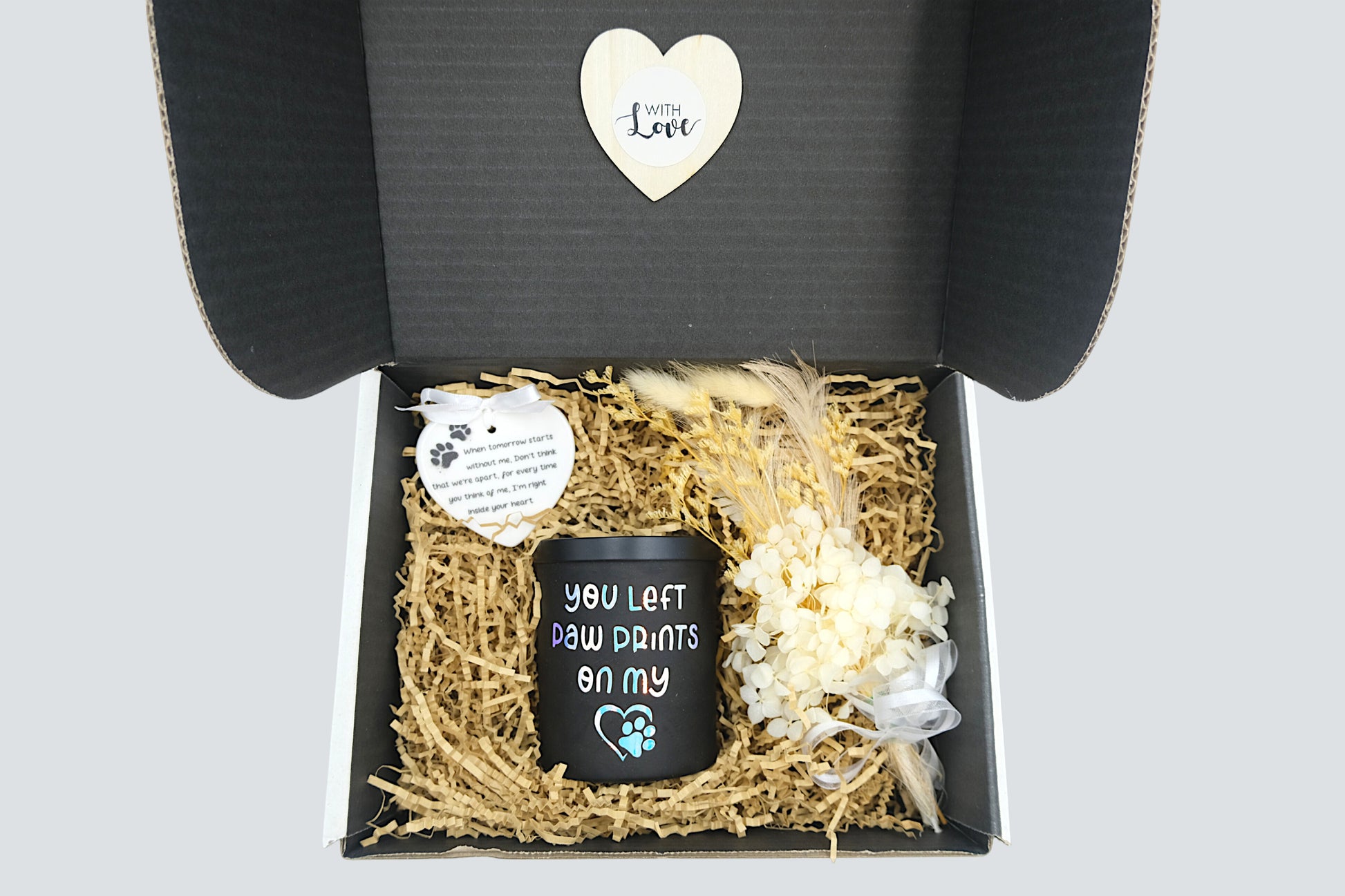 Large Candle Saying "You Left a Paw, Print on my Heart", Preserved Flower Spray, Inspirational Love Heart Plaque. Presented in a Gift Box.
